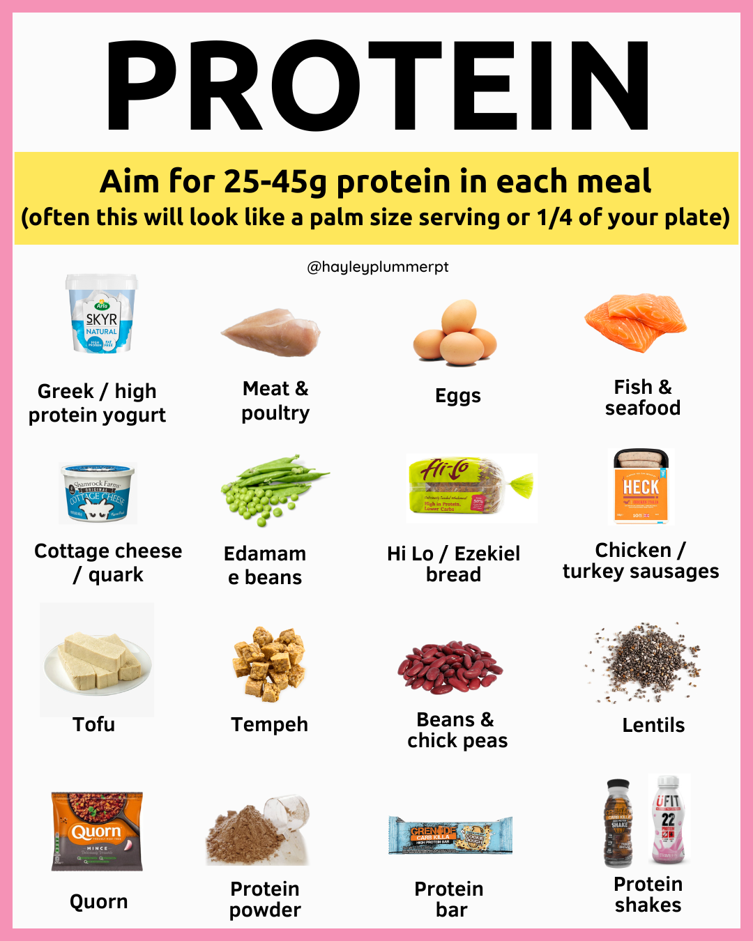- Including a clear source of protein at each meal (around 3–4 times per day) helps stabilise appetite and makes it easier to avoid overeating later