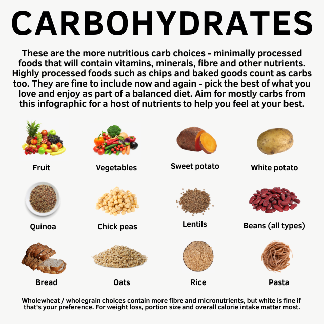 - Minimally processed carbohydrates like oats, potatoes, lentils and beans contain fibre, vitamins and minerals that support overall health
